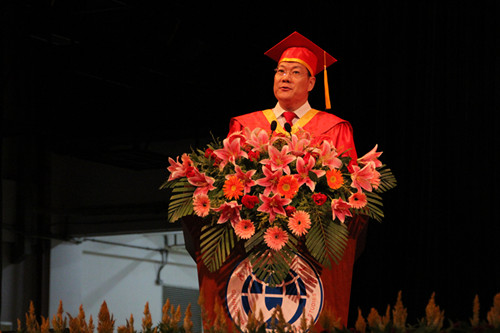 仲伟合校长首先热烈祝贺历经四载苦读的毕业生圆满完成学业。在他的致辞中,他连用数个“那些年”与毕业生共同回顾了在广外的青春记忆,语心湖的天鹅、倒数的钟楼、北校区的“海”……就算离开,也会带着沉甸甸的记忆,因为“广外的印记烙上了,就是一辈子的牵挂”。“人生没有如果,只有结果”,仲伟合校长同时勉励毕业生坚持学习、坚持自己的选择。他也向在场毕业生表达他衷心的祝福“期盼同学们成为未来的‘高富帅’和‘白富美’——高在学识、富在精神、帅在行动、白在品质、富在内涵、美在心灵”。仲伟合校长一番热情洋溢、语重心长的临别寄语如潺潺流水般流入毕业生的心田,引起了在场同学的共鸣,现场响起雷鸣般的掌声。