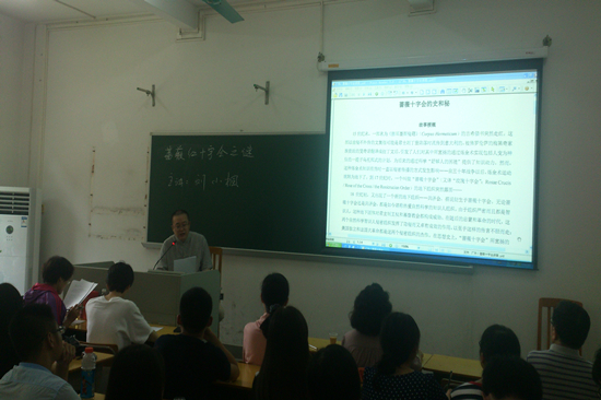 刘教授首先介绍了蔷薇十字会的由来,它的雏形是17世纪由一个基督徒创办的用炼金术为大众治病的兄弟会,并有三大宣传手册。其信条追求物质和灵魂的联合。同时教授又介绍了蔷薇十字会在欧洲的传播情况、其创始人的生平经历以及其经历所反映出的欧洲文化与犹太教神秘主义、阿拉伯文化以及古希腊文化的密切关系。