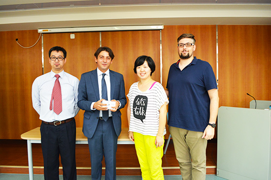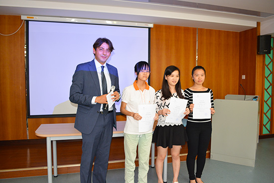 本网讯 10月21日下午,第十五届意大利语言文化周系列活动之专业讲座暨斯特雷佳文学奖入围作品笔译比赛颁奖仪式在我校MBA教育中心306教室隆重举行。出席本次会议的有意大利驻广州总领馆领事白思诺(Massimo Baldassarre)先生,意大利驻广州总领馆文化处负责人施丽萍女士,外教Matteo Brandi老师以及成人在线