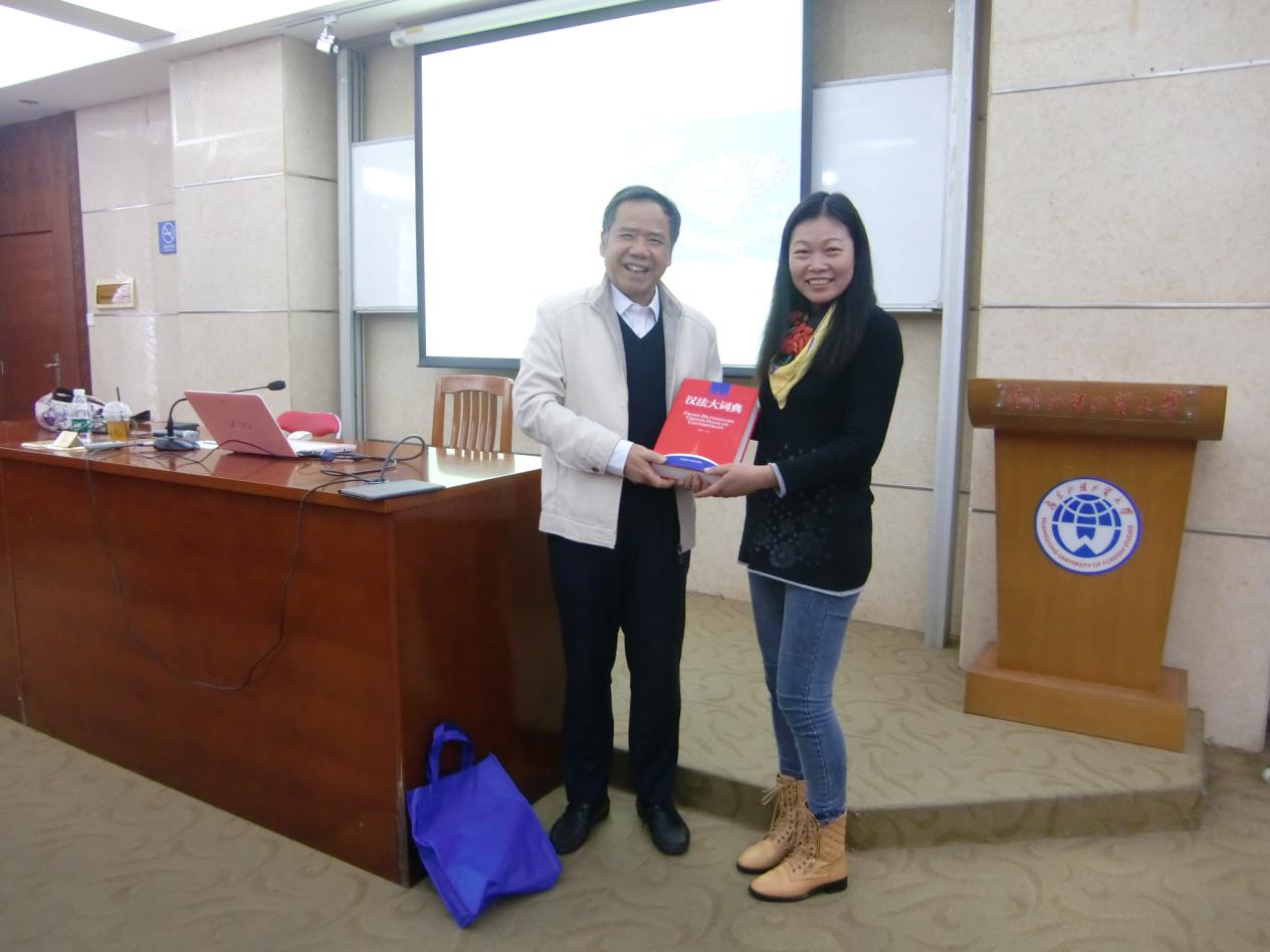 法语系学科带头人郑立华教授主持。郑立华教授对黄荭教授在翻译理论和实践方面取得的成绩大加赞赏,并提醒在场的研究生抓住此次难得的机会向黄荭教授取经。对黄荭教授进行介绍之后,郑立华教授代表法语系向黄荭教授赠送了由我校著名教授黄建华主编并签名的《汉法大词典》。