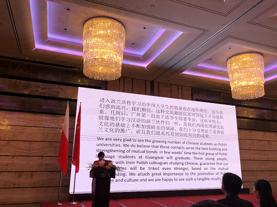 总领事约安娜•斯科柴克女士在讲话中指出,2018年对波兰有着特别的意义,100年前波兰在经历了123年的外族侵占后终于重获独立。在困难时期波兰人民对民族特性、本族语言、文化和宗教的传承与守护,使得波兰得以重生。同时也希望,中波全面战略合作伙伴关系的确立能让中波经济贸易往来能提升到更高、更广的层面,而广东省与波兰在创新、高科技和生态等领域的合作前景十分广阔。此外,2018年正值“中国-欧盟旅游年”,总领事很高兴能看到访波中国旅客数量正在逐年增长。