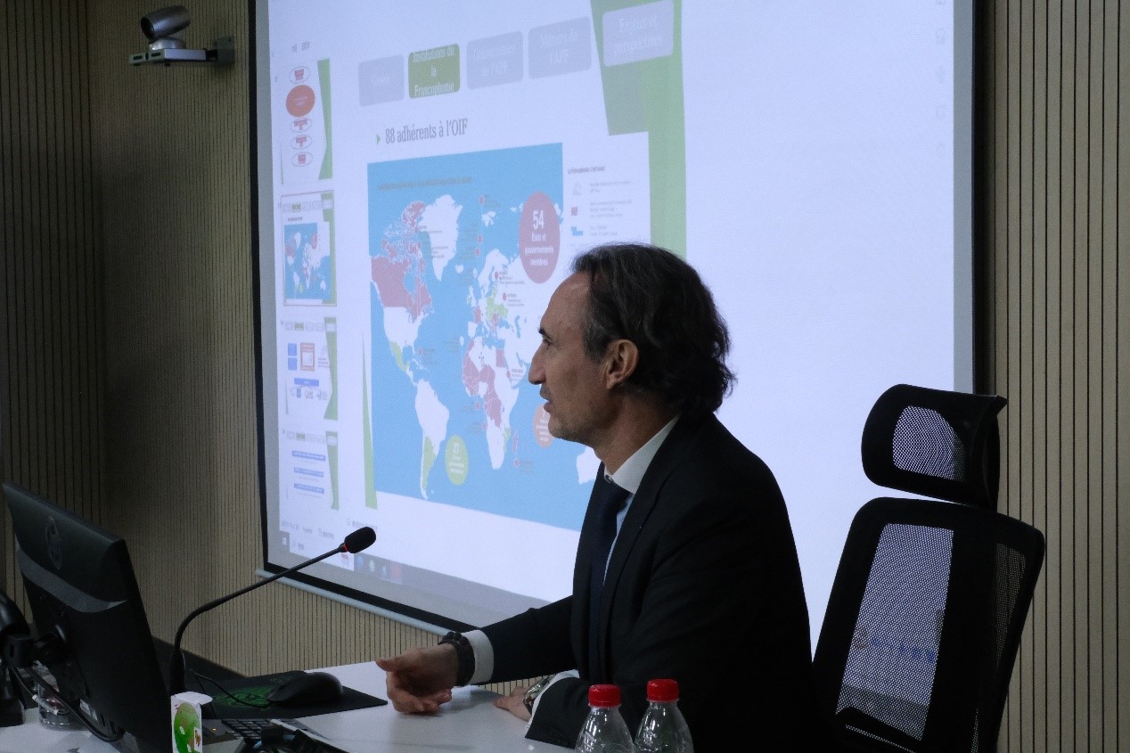 讲座伊始,赛斯兰先生简要地介绍了法语国家与地区的发展进程。从1880年由法国地理学家奥内西姆•勒克吕(Onésime RECLUS) 提出的“法语地区”(francophonie) 到如今拥有88个参与国的法语国家组织(OIF),各个法语国家与地区努力探索,寻求合作,促进多元化;法语国家组织也在不断壮大,蓬勃发展。
