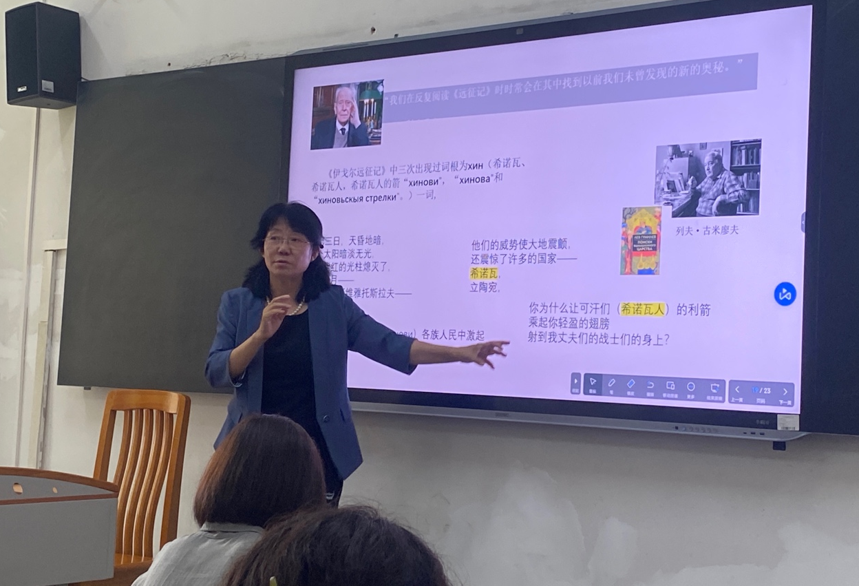 语言文学学科云山工作室首席专家、外国文学文化研究院教授、北京大学俄罗斯文化研究所研究员、《中国俄语教学》杂志副主编、中国外国文学学会俄罗斯文学研究分会副会长张冰教授在四教116教师为俄语学院师生带来宗岱人文讲坛学术讲座“《伊戈尔远征记》与俄罗斯英雄史诗”。本次讲座由陈欢副教授主持,吸引了俄语系师生们积极参与互动,现场范围活跃。