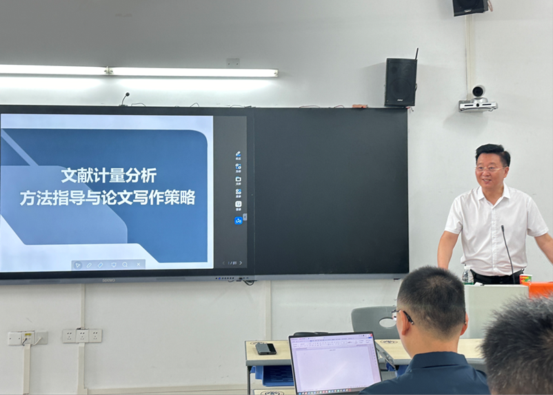 南国商学院副校长王铭玉教授主讲,讲座主题为“文献计量分析方法指导与论文写作策略”。
