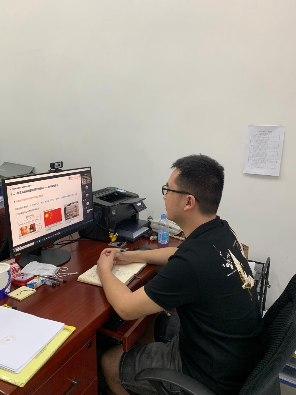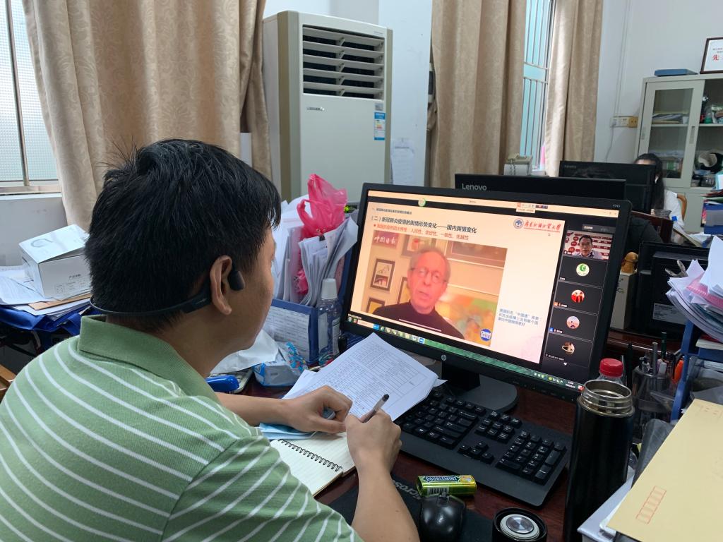 胡文涛教授首先对新冠肺炎疫情发展和舆情形势概况进行了简要介绍,而后分析了疫情发生后我国面临的国际舆论形势变化,并结合大量国内外新闻、视频报道,着重阐述了美西方对中国进行舆论攻击的原因及影响。其中,他特别强调到,我校作为一所国际化特色高校,要时刻关注海外交换学生安全。针对美西方势力的舆论攻击,胡文涛教授深入浅出地向我们剖析了我国应对国际舆论斗争所采取的措施:正面驳斥、揭批美西方国家的权谋;积极发声、及时回应国际社会关注;对话沟通,纠偏认知化解矛盾;争取舆论,坚定支持世卫组织发挥领导作用。