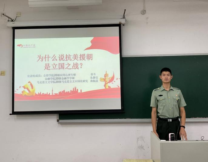邀请“百年党史”大学生宣讲团成员、公管学院张冬在六教B208为学院发展对象和积极分子开展题为“为什么说抗美援朝是立国之战”的专题党课,共计70人参与。
