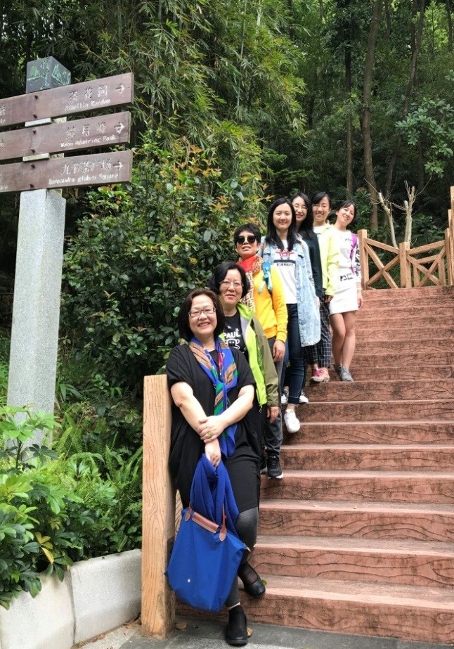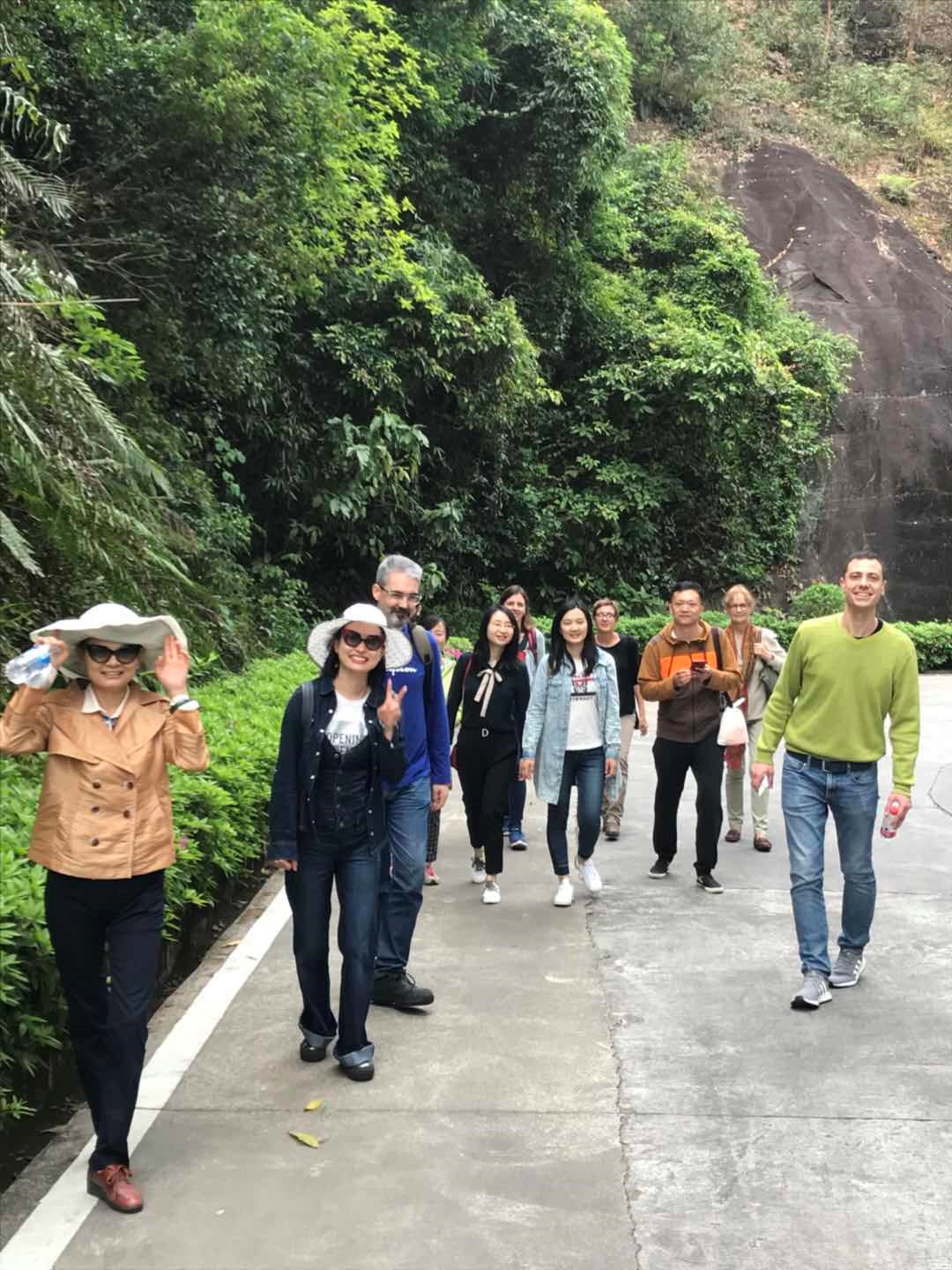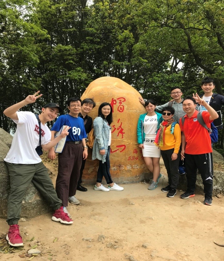 车到帽峰山后,大家纷纷健步上山。一路上,大家欢声笑语,一边兴致勃勃地聊着,一边快步向山顶前进。行走的道路十分宽阔,左右两边满是透绿的树木,中间夹杂着各色灿烂绽放的花朵,景致非常赏心悦目,让置身其中的人们暂时忘却了都市的嘈杂和喧嚣,完全沉浸在这美好的春色中。一个多小时后,大家登上了帽峰山顶,峰顶上视野开阔,清风徐来,大家顿时忘记了路途的劳累,或观望远处美丽的景色,或不停地拍照留念,或闲坐在路边小憩,交流着登山的感受,笑声不断,其乐融融。