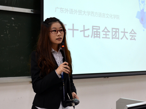 团委书记张璇。全团大会上,主席团以及团学13个部门齐聚一堂,在各部门的展示以及全团游戏互动中相互交流,增进了解,加强了整个团学队伍的凝聚力,深化了西语团学的团队精神。