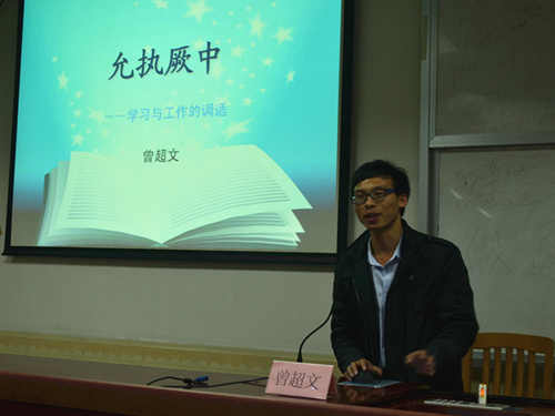 之后,中文学院的曾超文老师以他深厚的中文底蕴给我们讲述了如何处理学习、工作与生活的关系。他提到,团学干部需要具有吃苦耐劳的精神,首先要树立正确的学习工作观念,把做好工作与搞好学习统一;第二要做好大学阶段的规划;第三是掌握科学工作与学习方法,合理安排时间;第四是要养成良好习惯,加强人品自我修养。其后他以中庸之道的“允执厥中”一词点出了整个演讲的精髓。