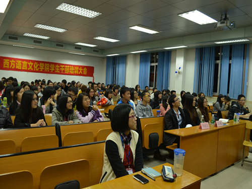 本网讯 12月6日晚,西语团学第三次学生干部培训大会在四教424举行。并由团委副书记金璐主持。本次培训会邀请到商英学院团委书记陈娓老师以及中文学院团委书记曾超文老师,与成人在线
