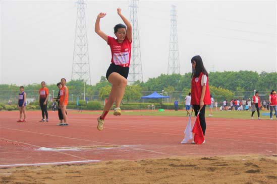 张莉同学在跳远赛场上奋力一跃