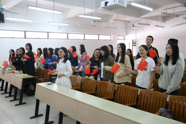 各小组阐述完心得后,同学们观看了留学生代言发言视频,以留学生的视角感受祖国带给我们的力量与底气。只有祖国强大才能保证我们在外的尊严与权利,虽留学在外,却时刻心系祖国。正如视频中一位留学生说的那样:“希望每一位学生都能像从前一样,以后一样,热爱我们的祖国,因为我们的祖国真的很优秀。”观看完视频后,同学们高举手中的小国旗,合唱歌曲《我和我的祖国》,“我和我的祖国,一刻也不能分割。”同学们将一腔的深情寄托在歌声中,伴随着歌曲旋律,本次活动气氛也随之推到了高潮。