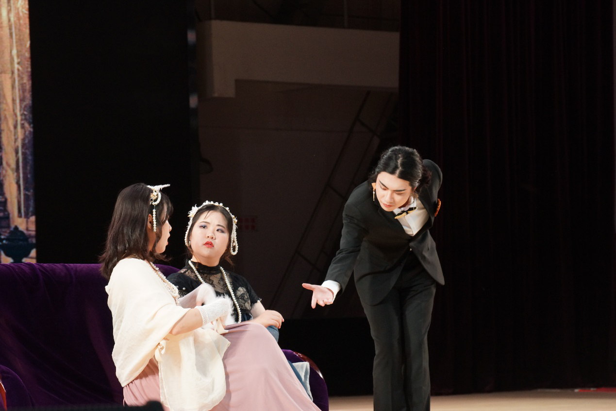 接下来登场的是意大利语剧组,他们的作品是《法斯塔夫》。故事发生在百年战争过后,社会动荡。身无分文的落魄爵士约翰·法斯塔夫为脱离困境心生一计:他希望勾搭上美丽的已婚妇女爱丽丝·福德,继而夺取她有钱丈夫福德先生的财富。收到情书的爱丽丝惊讶于身材矮胖、容貌不佳的法斯塔夫竟有此贼胆做出如此既不道德又痴心妄想的白日梦,于是她决定假意接受他的邀约并让他丢尽脸面。故事内容轻松流畅,以喜剧为结局,现场一片欢乐。