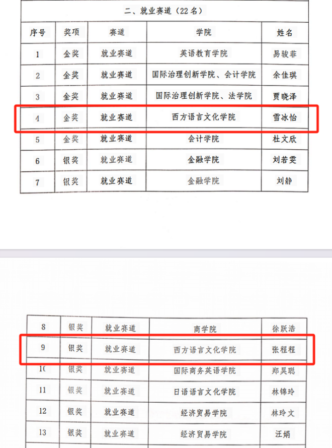 学子成绩喜人,共有5人获奖:本科21级麦文疑、王婷、杨蕾蕾三位同学分获成长赛道金、银、铜奖;硕士23级雪冰怡、张程程分获就业赛道金、银奖。冯迪南、陈湘蓉两位老师获评优秀指导老师。
