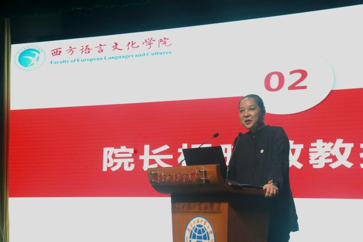 的发展历程、学科特点和人才培养目标,分享了属于西语的几个“广外之最”:广外历史最悠久文化学术底蕴最为深厚的学院之一、广外专业最多的学院、以及广外硕士点、博士点最多的学院,并鼓励全体新生“好好成长、好好学习、好好生活”,成为大写的人、优秀的人、幸福的人。杨院长还现场演唱粤语歌《朋友》,对学生表示欢迎,并祝愿全体新生在广外书写绚丽的青春华章。