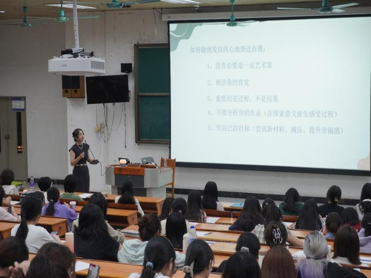 在艺术疗愈知识科普中,付蒙为同学们讲解了艺术疗愈的定义,以及艺术疗愈是如何发挥作用的,以浅显易懂的方式让大家了解艺术疗愈的概念,拉近同学们与艺术的心理距离。同时,同学们也了解到在艺术创作中如何打开自我,诚实地与自己的潜意识对话,将艺术作为一件用来沟通的工具来发自内心地表达自我。