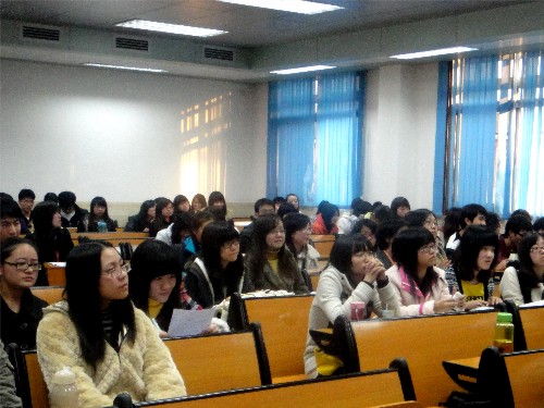 随后,便进入了志愿者经验分享环节。来自08法语的梁山精彩讲述了他作为亚残大家庭助理陪同的经历。同时,兼任突尼斯的国际残奥委员会执委陪同的他,在两份工作中都遇到了很多无法想象的困难。而其中,陪同任务的突然,和陪同对象资料的缺乏,更都考验着应急能力的极限。任务开始的第一天,能讲一口流利法语的他在去机场接机的路上一遍遍地查阅“法语王”,生怕出什么差错,但就是凭着这份认真和执着,以及超强的应变力,最终,他也圆满地完成工作,并赢得了他所陪同的执委的好评。在用幽默生动的语言讲述他做志愿者的经历过后,他又简单介绍了亚残大家庭助理的志愿者工作,工作大体分为宣传报道,后勤保障,安全保障,激励工作等环节,而他在工作中体验了从联系交通,企业人,到志愿者徽章的制作,再到慰问品的采购发放等各项任务,收获良多。在一次志愿者后勤保障用品的紧急采购工作中,他们在两个小时之内买了3000多个暖保给志愿者保暖,过程的艰辛令在场许多同学都深表感动。