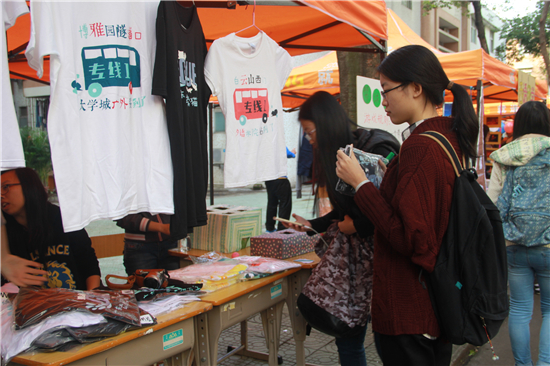 参加本届交换空间活动的共有五个摊位,分别是:“江左萌”杂货铺摊位、“408巴巴妈妈”手工艺品摊位、“WECHO”文化衫摊位、西语团学摊位、“昨日易逝永恒青空”摊位。活动开始,现场热火朝天,路过的学生都不由自主地停下脚步。