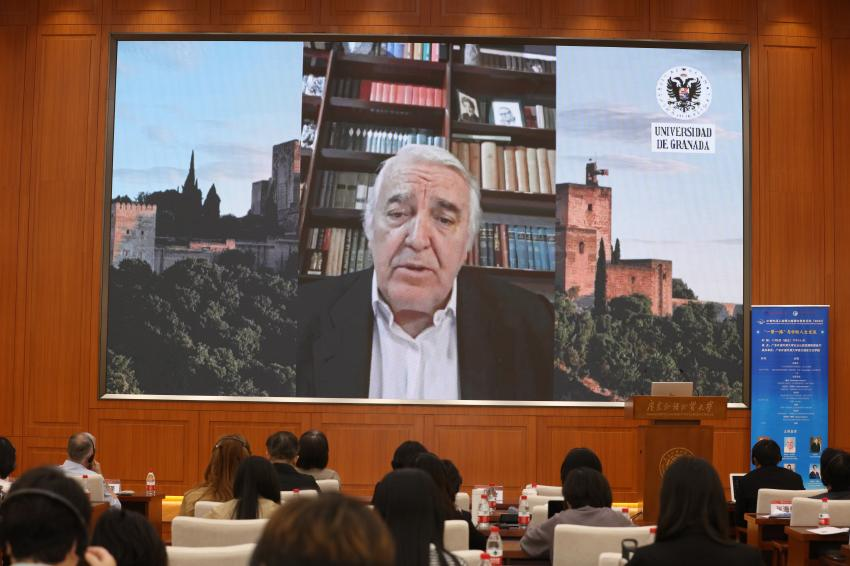 西班牙格拉纳达大学拉斐尔·古斯曼(Rafael Guzmán)教授分享的题目为《跨越文化:我的西班牙生活与学术之旅》。古斯曼教授指导的两名中国博士生邢媛与李光辉正在格拉纳大学就读,他们在论坛上用西班牙语分享了自己在西班牙的学习和生活。邢媛讲述了她初到西班牙时的适应阶段,分享了在当地亲身感受到的生活习惯和文化差异,强调了语言和文学在促进文化交流的重要性。李光辉分享了他在西班牙的学术生活,比较了中西教育体系的差异,并鼓励中国学生多利用这些经历来拓展视野。两位分享人都表达了对促进中欧文化交流和相互理解的坚定信念。