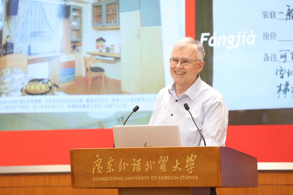 人类学家、法国国家博士、法国巴黎西岱大学荣休教授戴泽(Dominique Desjeux)教授主旨发言题目为《中国日常生活近三十年的观察研究(1997-2004)》。戴泽教授于1997年应郑立华教授邀请来到中国,开始与广外跨文化研究团队合作,共同探讨人类学研究方法。戴泽教授见证了中国社会高速高质量的发展,特别是中国普通民众日常生活水平的大幅改善。戴泽教授分享了大量在中国各地拍摄的老照片,大到楼房、街道、商场的变迁,小到厨房、卧室、食品、化妆品等物质生活的细节变化。他对近三十年来中国翻天覆地的变化表示惊叹与赞扬,更表示未来还要共享更多美好记忆,与大家一道共同讲好中国故事。