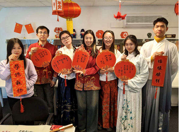 2024年4月20日,德语2021级学生张赫菱、江林颖作为志愿者,在德国帕德博恩孔子学院参与了国际中文日活动。活动中,交换生们用德语向前来参加活动的国际友人讲解了中国的十二生肖文化,并为他们分析了各自对应的中国生肖。更有趣的是,他们还教外国朋友如何在书签上正确地书写自己的中文名字以及对应的生肖汉字。在生肖转盘游戏中,一位德国女孩因为转到了自己对应的龙肖像而格外兴奋,她欣喜地向大家展示了身上龙纹样式的T恤,展现出对中国文化的浓厚兴趣与热爱。活动结束时,外国朋友们将写好的书签当作纪念礼物带走收藏,这一幕让交换生们深切地感受到学好一门外语的优势。