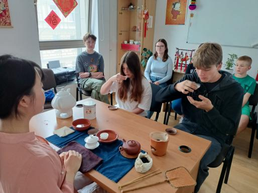 2023年6月17日,德语2020级正在什切青大学交换的7名学生受到中文老师丁丁女士的邀请,向中文学校的波兰学生们展示潮州工夫茶茶艺,和他们一起体验端午节的传统习俗。交换生蔡筱婉拿出了从家乡潮州带来的工夫茶茶具,考虑到中文茶艺词含有部分生僻字和文言文,对波兰学生来说难度较大,蔡筱婉还精心制作了中英对照的茶艺词PPT。整个茶艺表演时长约8分钟,波兰学生们都看得很认真。最后,大家一起品茶。茶汤清亮,回韵悠长,得到了众人的一致好评。时值端午将近,中国学生和波兰学生两人一组,互相帮对方系上漂亮的五彩绳,寓意驱邪避疫、祈福纳吉。最后,大家一起拍照,为这次中国传统文化体验活动画上圆满的句号。