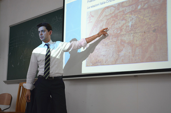 本网讯 2014年11月20日下午两点,意大利语讲座于六教B404召开,意大利语系全体师生出席讲座并认真聆听了主讲教授欧阳乔的演讲。本次讲座主要内容为中意当前的经贸政治等各方面关系的介绍,都灵的人文历史以及意大利人对中国的看法等。