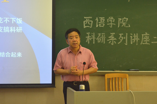 在杨可院长简单的开场白后,郑立华教授直奔主题,简单概括了小语种专业教师的科研之路。接着,他提出了教师们在现阶段面临的主要问题:教学与科研间的冲突、教师生活压力大、科研体制不合理和小语种论文发表途径小。他也指出在这些问题之下呼吁改变科研体制、怨天尤人和置之不理等做法是无用的,小语种专业教师们关键是要“动起来”,要时常反省自己最近在做什么、应该研究哪一方面和是否有写论文。