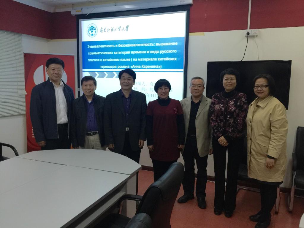 袁丽霞的论文从语言翻译等值与否的角度探讨了俄语动词时体范畴在没有时体范畴的汉语中的表达问题。答辩过程中,袁丽霞介绍了论文撰写、修改的过程,较好地回答了五位教授提出的问题。最后答辩委员会一致通过了袁丽霞的博士学位论文答辩。