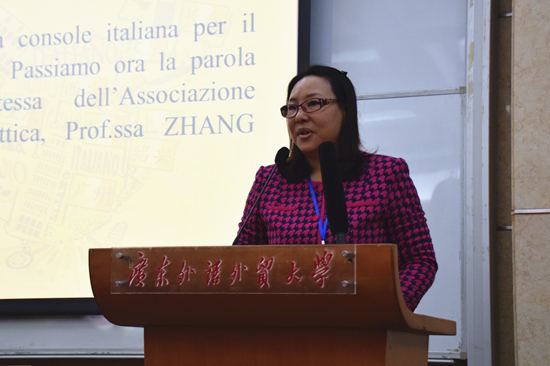 随后发言的是中国意大利语教学研究会会长张宇靖教授。在表达了对与会嘉宾和全体工作人员的感谢后,她回顾了意大利语在中国教学的发展历史。在这六十多年中,意大利语作为非通用语在中国快速发展,中意双方学者日益深入交流,这与中意政府的大力支持是分不开的。她提出,在当今网络信息时代,新媒体的出现对教师们提出了新挑战,而本次研讨会的主题便是新媒体在意大利语教学中的应用。最后,她还鼓励与会教师在本次研讨会中积极发言,提出自己的建议。