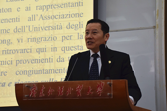 意大利语系主任张海虹副教授主持。开幕式上,副校长方凡泉教授发表了讲话。他对所有出席此次活动的来宾们表示了热烈的欢迎,随后他简要地介绍了意大利语教学在广外的发展情况及已取得的成绩,并预祝研讨会取得圆满成功。