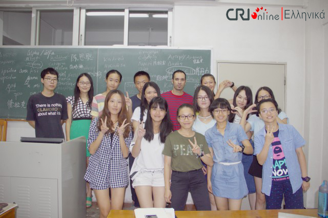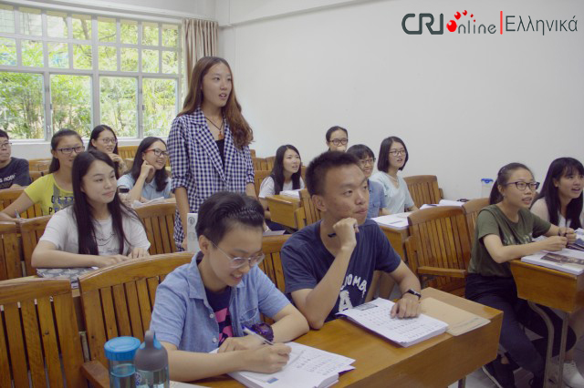 中国国际广播电台记者首先采访了希腊语大一新生的第一节课。学生们在第一节课上学习了希腊语字母,了解了希腊概况。课上还举行了一个小型的命名仪式,每位学生都选择了自己的希腊语名字。当同学们被问起为何选择希腊语作为自己的专业时,他们纷纷表达了自己对希腊悠久历史、多彩文化、优美景色的向往、爱慕和浓厚兴趣。