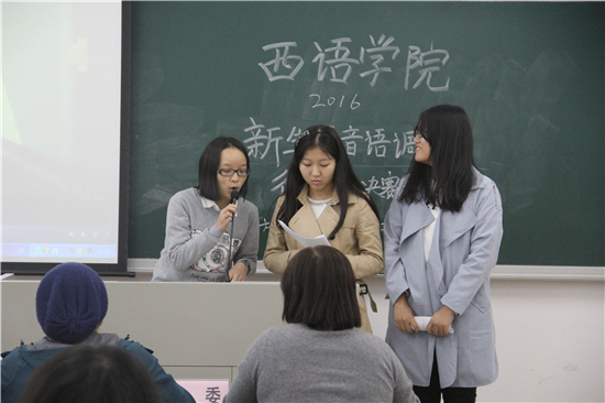 新生语音语调大赛西班牙语系决赛于二教B302举行。林婧老师、吴凡老师以及外教Eva担任此次比赛的评委。