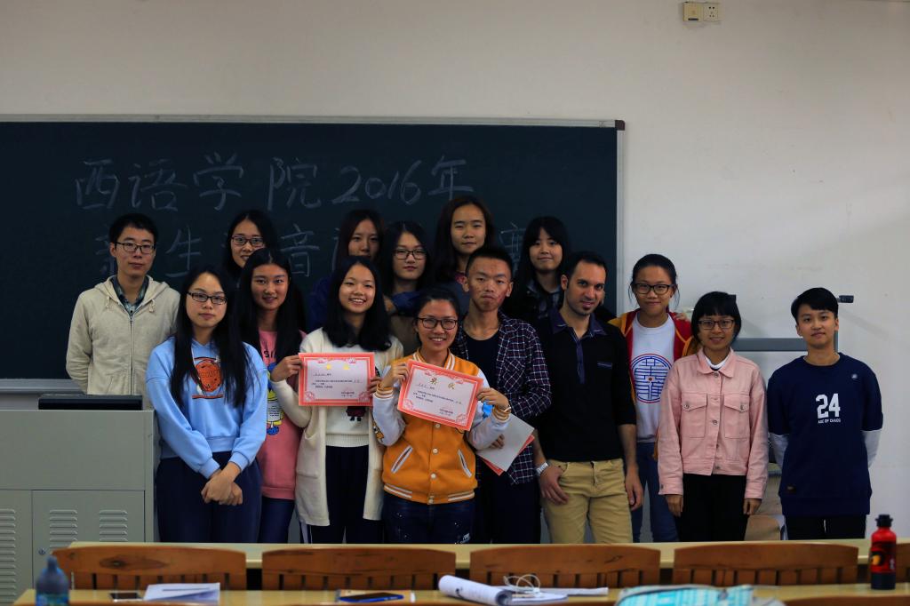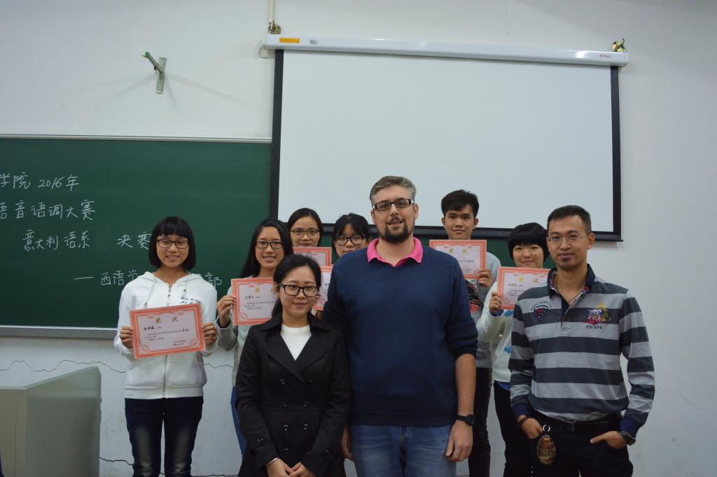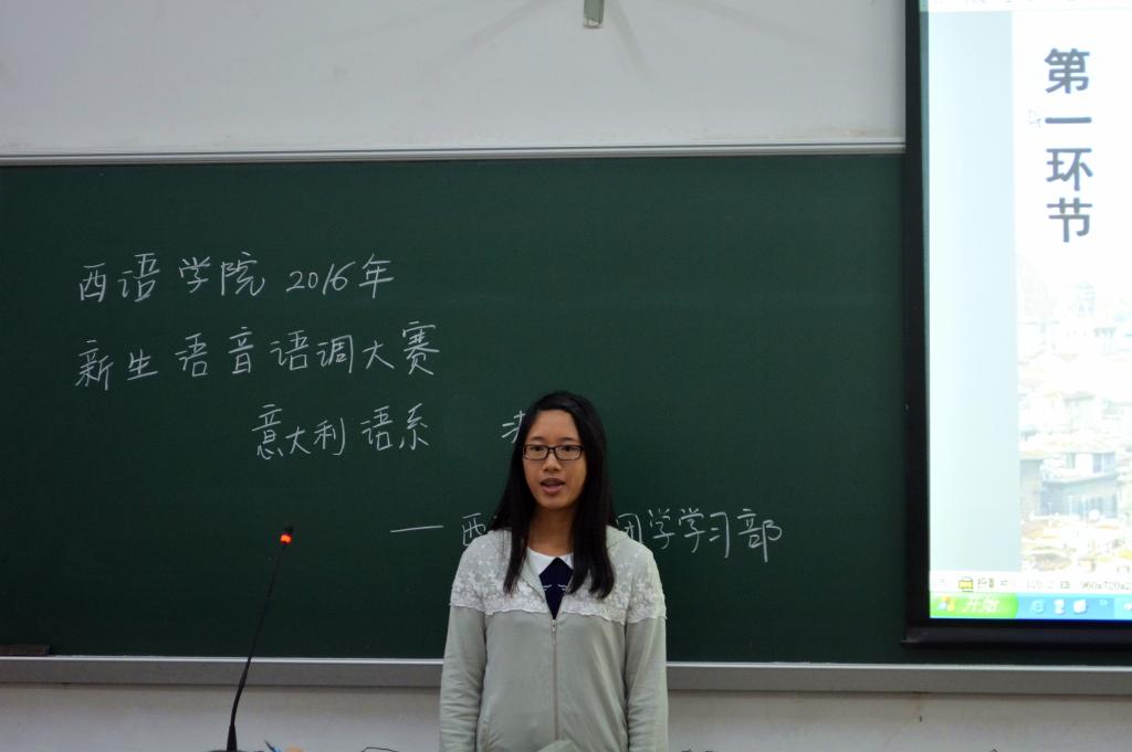 11月10日下午两点三十分,2016级新生语音语调大赛——意大利语系预决赛在四教115如期举行。意大利语系的高翔老师、外教Matteo以及意大利驻广州领事馆的黄女士莅临比赛现场并担任本次比赛的评委,2016级意大利语系的26名学生参与了本次比赛。