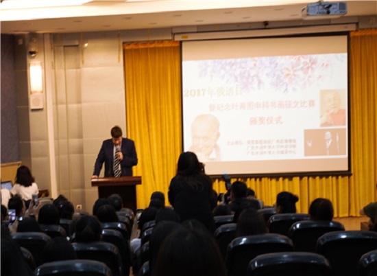 本网讯 2017年6月15日下午三点,第七届“俄语日”暨纪念叶甫图申科征文书画比赛颁奖仪式于我校七教水上报告厅成功举办。出席本次“俄语日”的嘉宾有俄罗斯驻广州总领事馆文化随员格里高利·科雷什金,广外成人在线