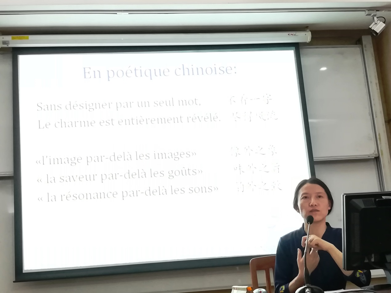 车琳教授以波德莱尔、魏尔伦、兰波、马拉美的几首诗歌为例,展示了其与雨果式浪漫主义诗歌、戈蒂埃式巴拿斯派诗歌的差异,与实证主义哲学和自然主义文学的决裂,凸显了象征主义诗人的追求。她特别引用了我校已故著名学者梁宗岱先生在其名篇《象征主义》(收入《诗与真·诗与真二集》)中,对“象征”的定义,在向梁先生致敬的同时,过渡到了对中国古代诗歌的象征修辞的介绍和讨论,认为“象征是一种修辞和一种世界观”。随后,她将这种个别性、片段性的讨论,转化为对比较文学的平行研究的认同和运用,升华为对中法诗学理论和实践的系统研究。最后,她从影响研究的角度,指出了魏尔伦、马拉美创里面中国元素的存在事实,以及中国现代诗人,诸如李金发、王独清、穆木天、冯乃超、戴望舒、卞之琳、梁宗岱,在法国象征主义诗歌影响下的创作,及其在中国现代诗歌发展中的历史意义。
