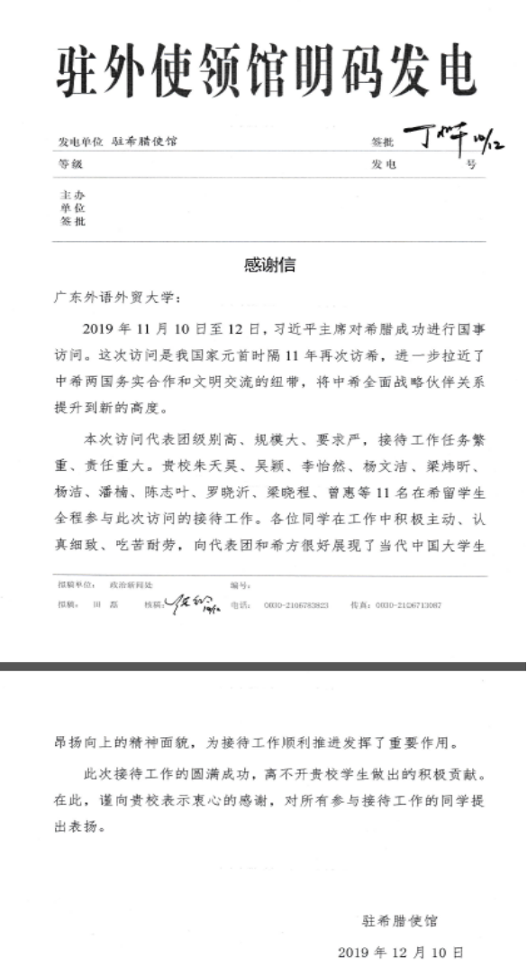 我驻希腊使馆向我校致感谢信