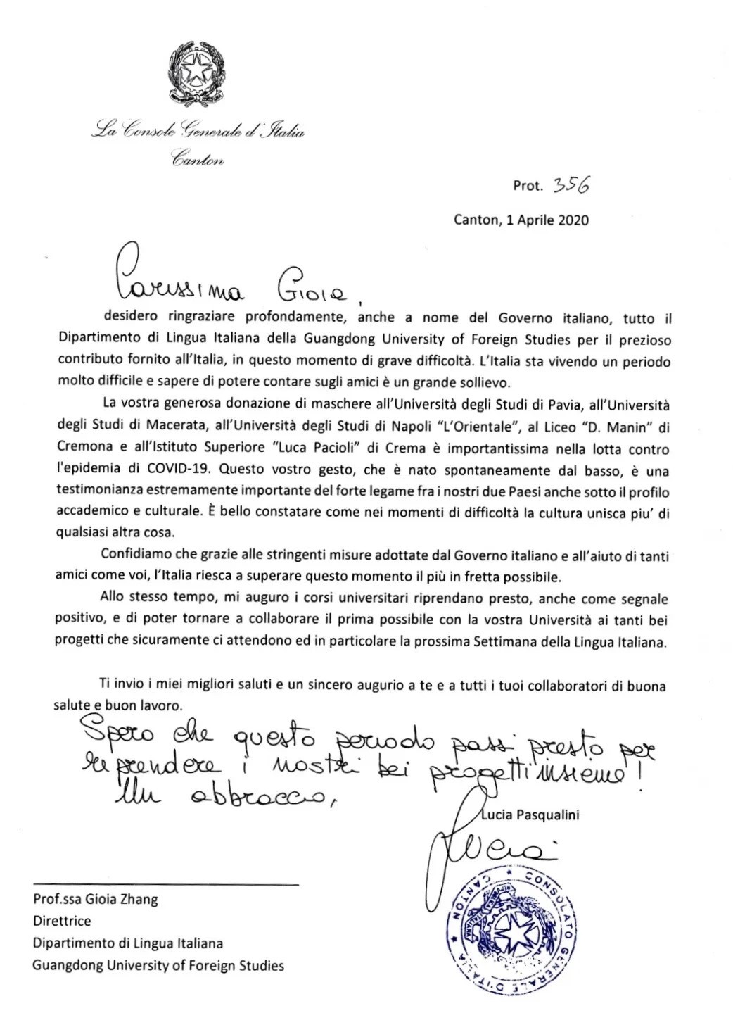 本网讯 近日,意大利驻广州总领事白露茜女士(Lucia Pasqualini) 向广外意大利语系发来感谢信。信中,白露茜总领事就广意师生在新冠疫情期间组织的捐助活动表示感谢,并希望意大利驻穗总领馆与广外继续保持良好的合作,促进中意文化交流。
