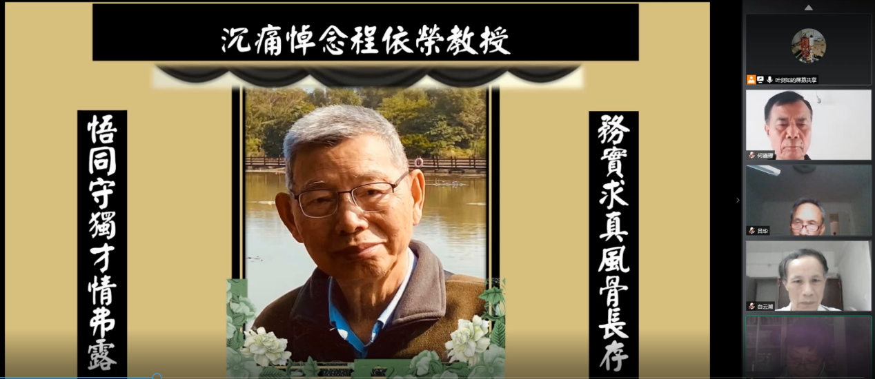 法语系退休资深教授程依荣先生因病于2020年6月29日不幸逝世。由于受疫情影响,为了缅怀先辈,7月5日下午,法语系举办了一场线上“程依荣教授追思会”。追思会由法语系主任叶剑如主持。屏幕中间是鲜花簇拥着的程依荣教授的遗像,上面挂着“沉痛悼念程依荣教授”的横幅,两边是程依荣教授的夫人李仪芳女士亲自为他撰写的挽联“悟同守独才情弗露,务实求真风骨长存”,场面庄严肃穆。