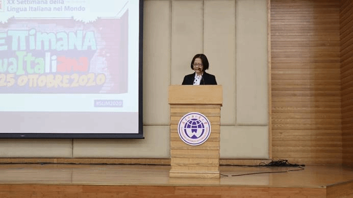 开幕式首先有杨可院长致辞,她对意大利驻广州领事馆对我校意大利语专业建设的支持表示感谢,并对意大利语专业成立20周年表示祝贺。我校今年迎来了第一批意大利语硕士生,而意大利语专业在2019年被评为省级一流专业建设点,并将在今年冲击全国一流专业建设点,杨可院长表示她对此充满信心。