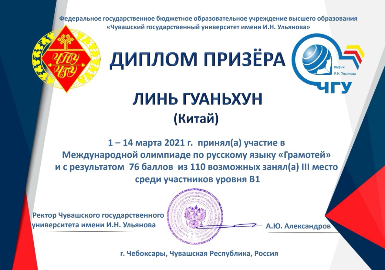 本网讯 2021年3月1日至14日,由俄罗斯楚瓦什国立大学主办的《读书人》国际俄语奥林匹克竞赛举行。我校成人在线 俄语系学生林冠宏和吴浩添以优异成绩战胜同组来自全球多个国家和地区的参赛选手,获得B1组第三名。