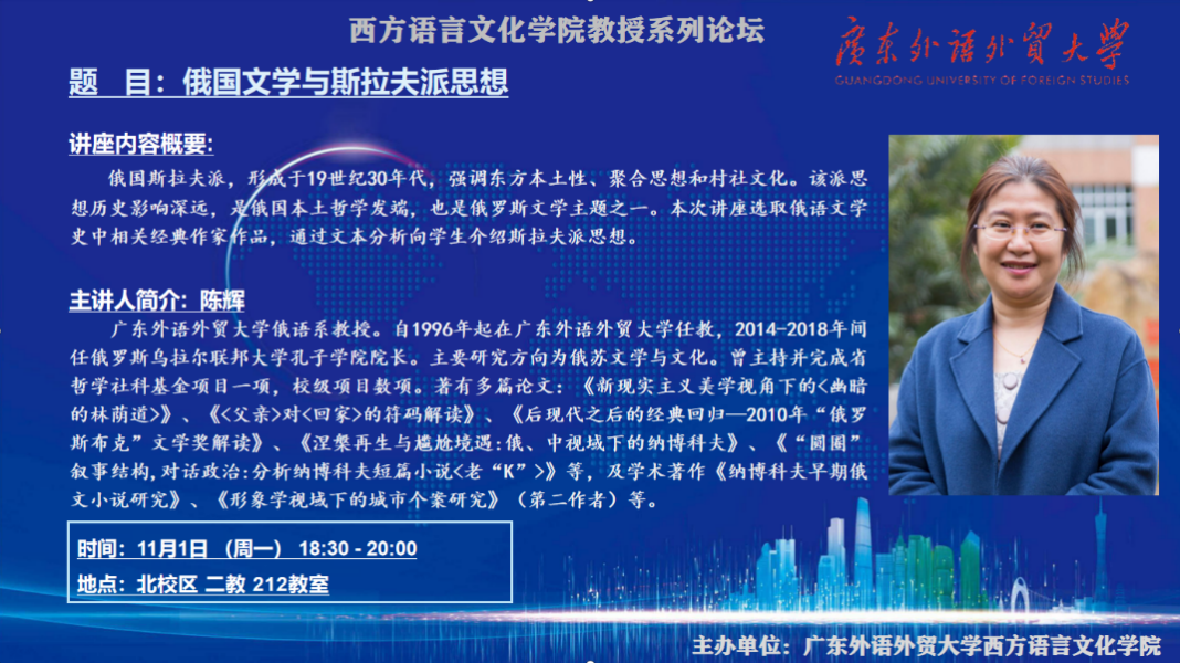 俄语系陈辉教授带来的《俄国文学与斯拉夫派思想》。讲座由研究生办公室主任臧宇老师主持,成人在线