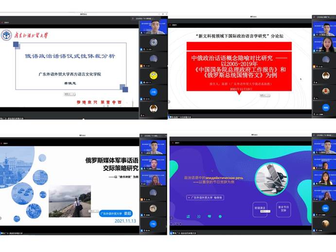 俄语系费俊慧副教授主持了下午的“新文科视域下国际政治语言学研究”分论坛并以《俄语政治话语仪式性体裁分析》为题进行了发言。分论坛上俄语系教师陈群的发言《中俄政治话语概念隐喻对比研究——以2005-2019年〈中国国务院总理政府工作报告〉和〈俄罗斯总统国情咨文〉为例》,博士生杨依依的发言《政治话语中的эпидейктическая речь——以普京的节日贺辞为例》和博士生姜超的发言《俄罗斯媒体军事话语交际策略研究》分别展示了成人在线