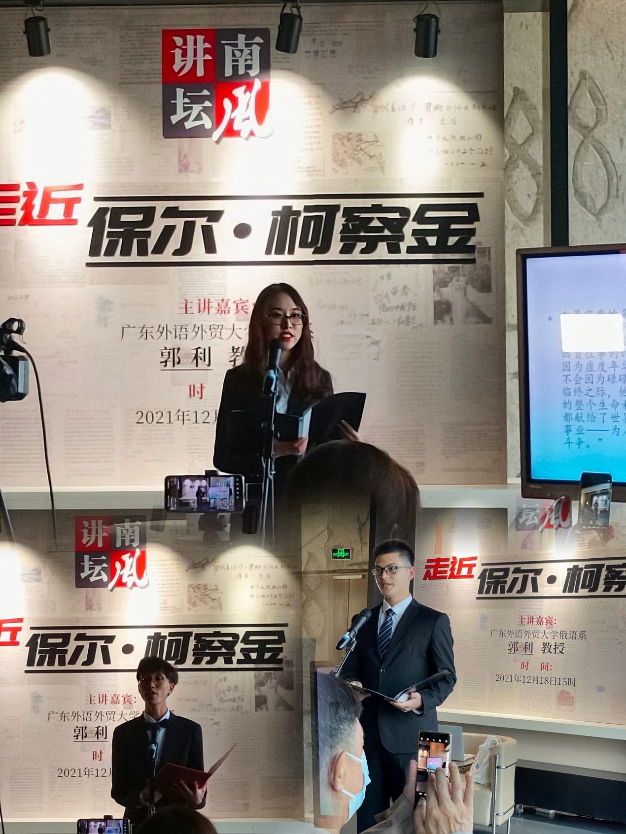 参与本次沙龙活动的几位同学也分享了自己的感受。潘晨同学表示:“《钢铁是怎样炼成的》这部小说自己很小的时候就读过,没想到有朝一日可以在公开活动上朗诵俄语版的经典名言。”潘星宇同学表示:“在场的观众中,无论是朝气蓬勃的青年人,还是须发皆白的老先生,都沉浸其中,令人感动。希望以后自己能阅读更多书籍,增加对俄罗斯的历史和现实的了解。”参与了广图和佛图两次活动的吴浩添同学表示:“感谢广外老师给予如此宝贵的机会,让我们能够在精彩纷呈的活动中展现俄语朗诵的魅力,歌颂俄国革命先驱坚强无畏的战斗精神。”(撰写:潘晨)