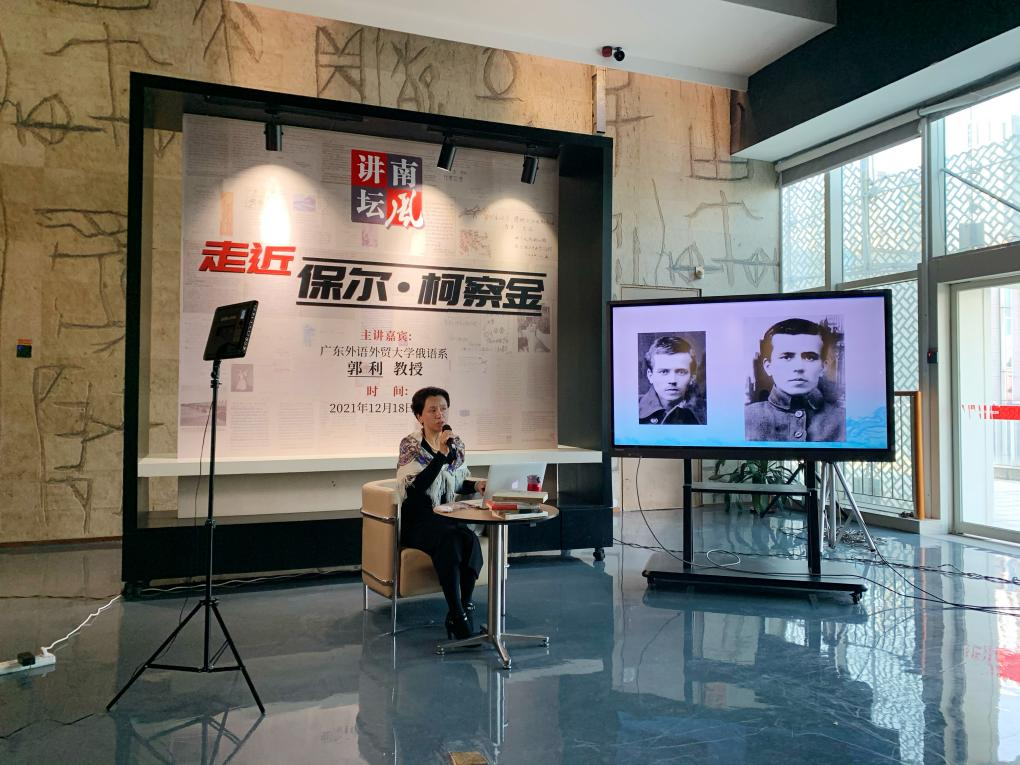 俄语系一众学生在郭利教授带领下,前往佛山市图书馆参加题为“走近保尔·柯察金”的“南风讲坛”[1]沙龙分享会。继广州图书馆成功举办展览“建党100周年,重读《钢铁是怎样炼成的》”的第一站后,佛山市图书馆接力第二棒,再次邀请郭利教授带来精彩分享,与观众一起重温红色经典的魅力,感受战争年代的革命豪情。本次活动由莫斯科奥斯特洛夫斯基故居博物馆、广州图书馆、佛山市图书馆和成人在线
