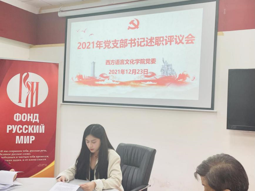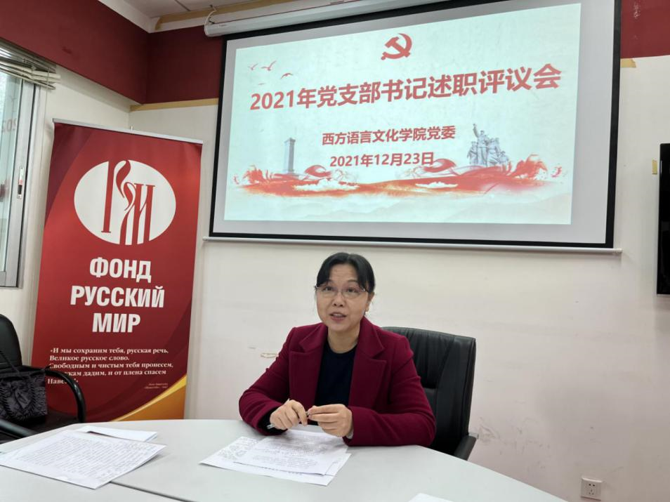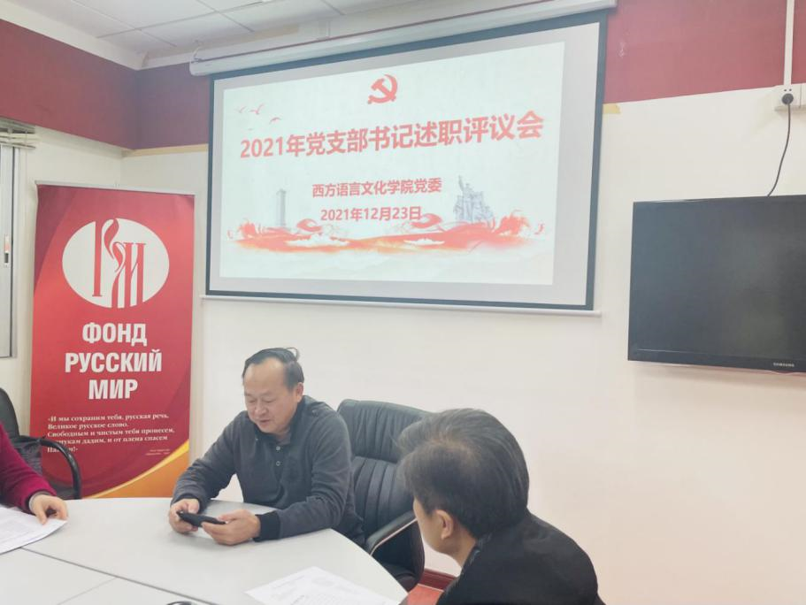 党委在俄语中心召开师生党支部书记述职评议会议,会议由学院党委书记敖湘晖主持。各党支部按照教工第一党支部、教工第二党支部、教工第三党支部、法语本科学生党支部、德语本科学生党支部、西语本科学生党支部、俄语本科学生党支部、非通用语本科学生党支部、法俄研究生联合党支部、德西研究生联合党支部的顺序依次进行述职。