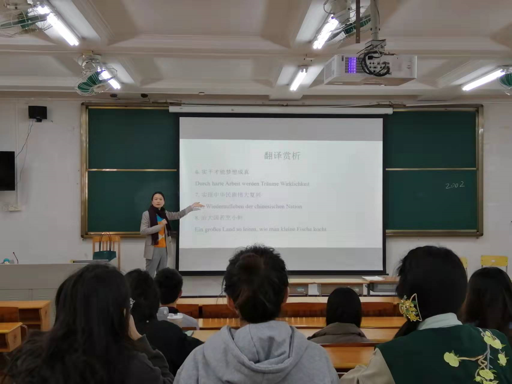 首先是卢铭君教授讲授了《习近平谈治国理政》中重要的概念及理念,并与学生共同探讨赏析德语译文。卢铭君教授在互动环节对学生进行复盘提问,学生积极参与抢答。