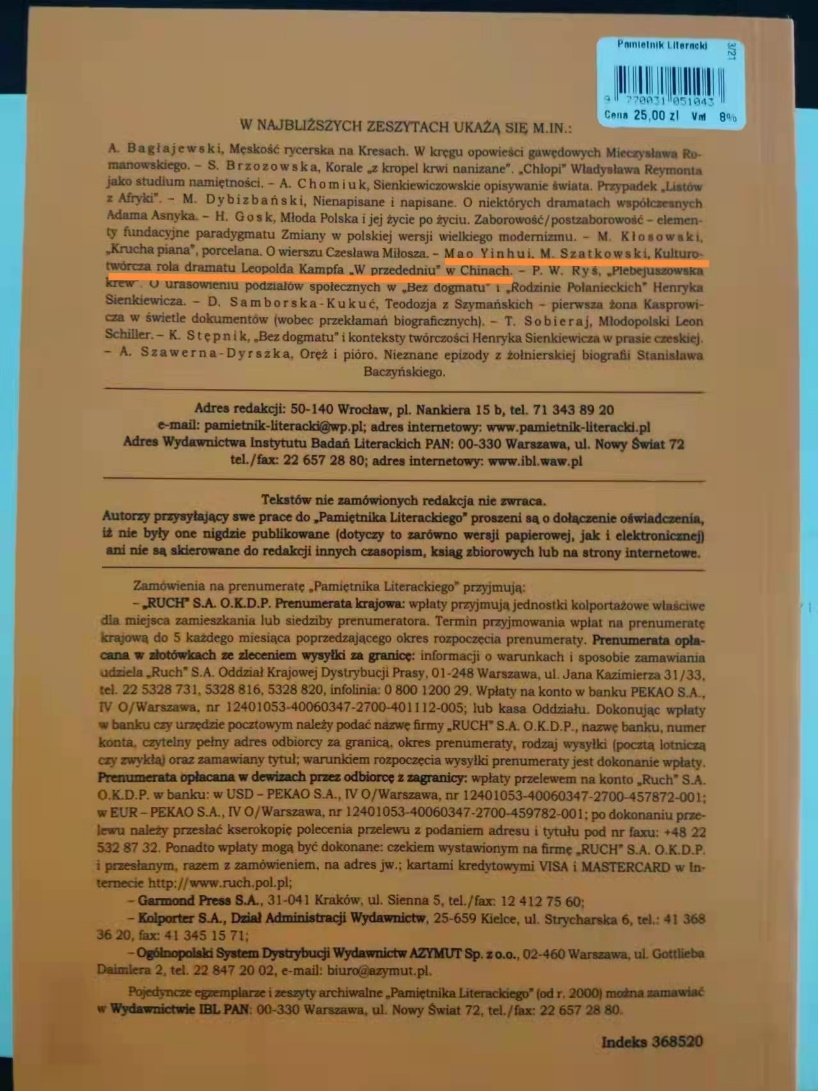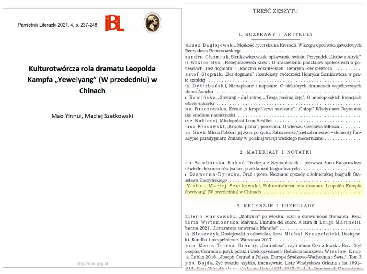 波兰语系主任茅银辉教授(第一作者)与波兰托伦哥白尼大学马奇·沙特科夫斯基(Maciej Szatkowski)教授的合撰论文《波兰剧作家廖抗夫的<夜未央>在中国的文化影响》,于波兰的波兰文学领域最高级别学术期刊《文学日志》(Pamiętnik Literacki)2021年的第四期上正式发表。