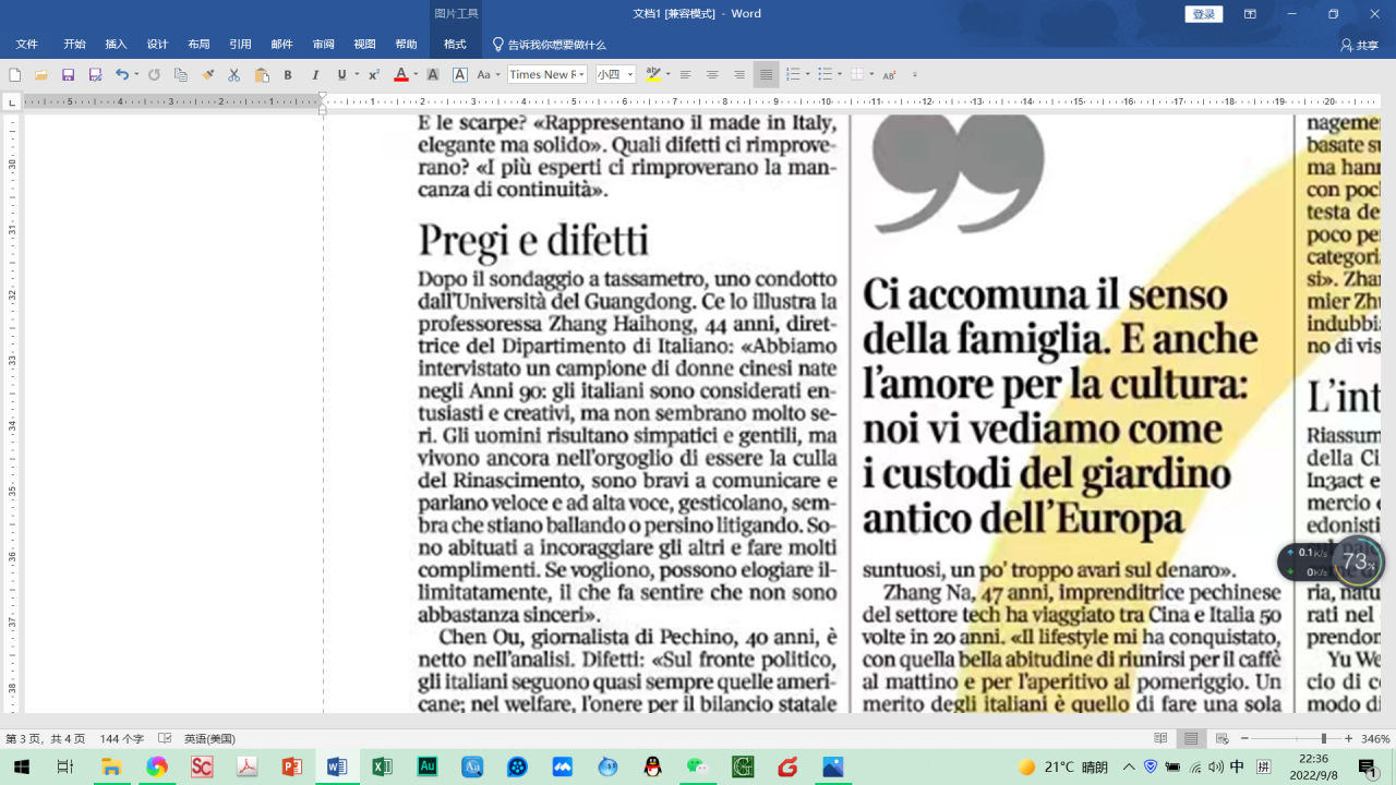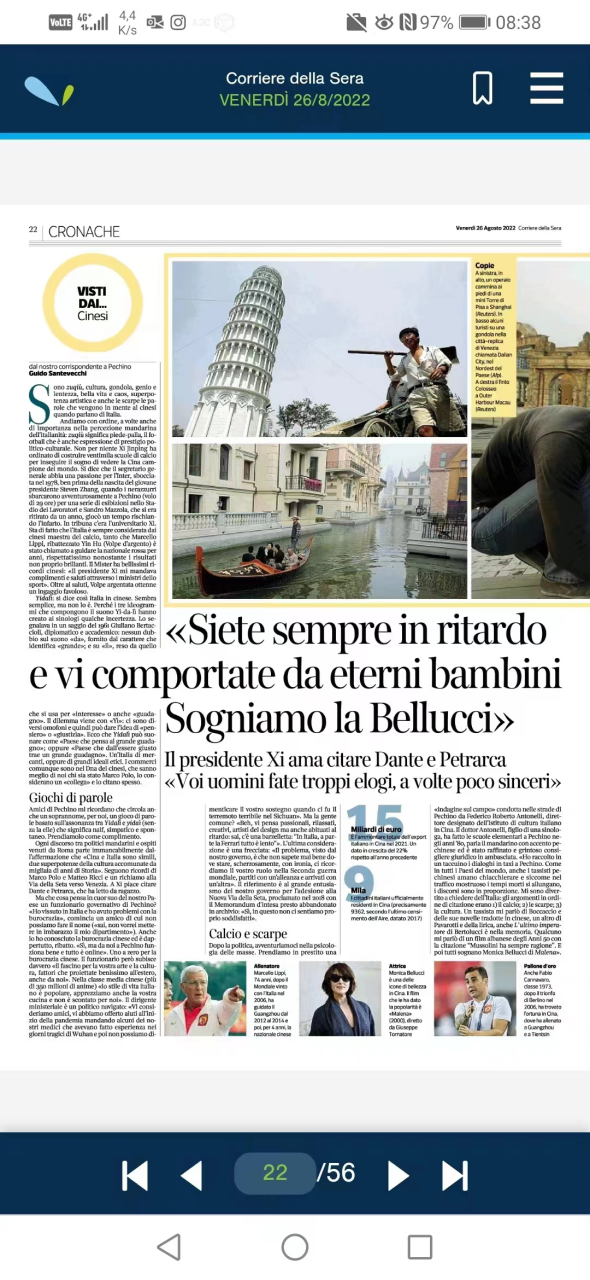 2022年8月26日,成人在线 意大利语系张海虹教授接受意大利《晚邮报》采访。该报是意大利第一纸媒,也是其国内历史最悠久的报纸。采访中,张老师分享了她研究成果《形象、消费与身份认同:中国“90后”女性对意大利奢侈品消费》中我国九零后女性心目中的意大利人形象。