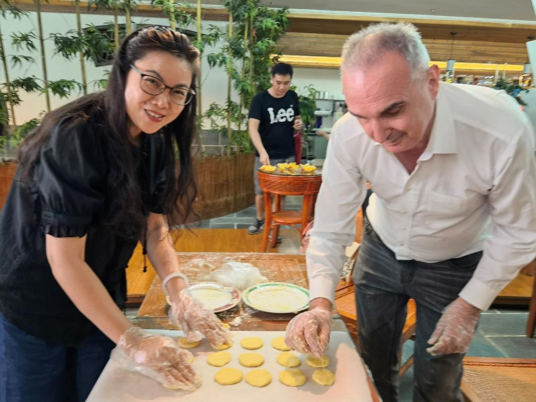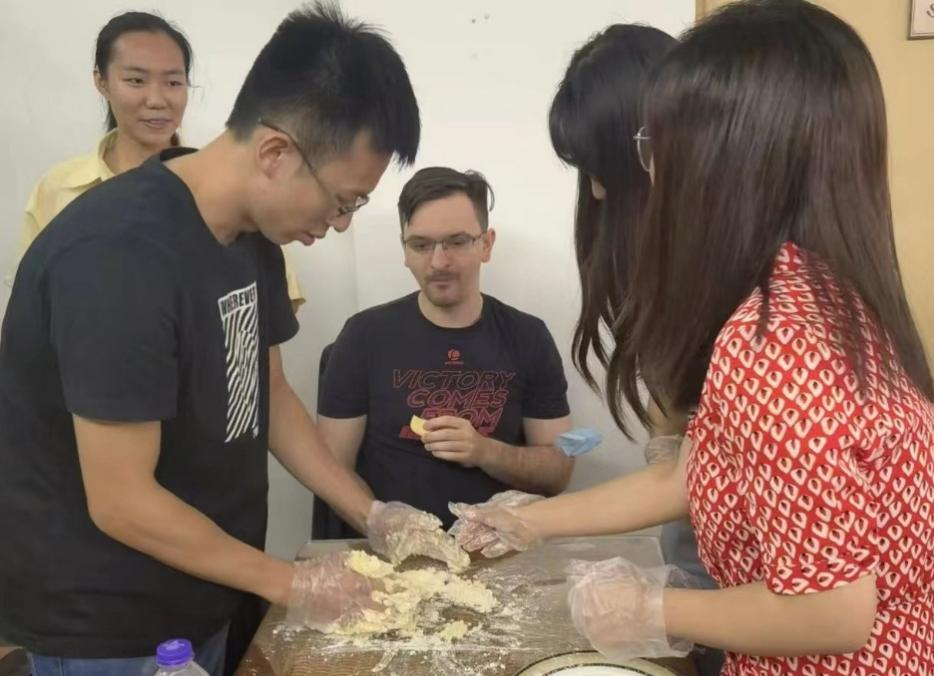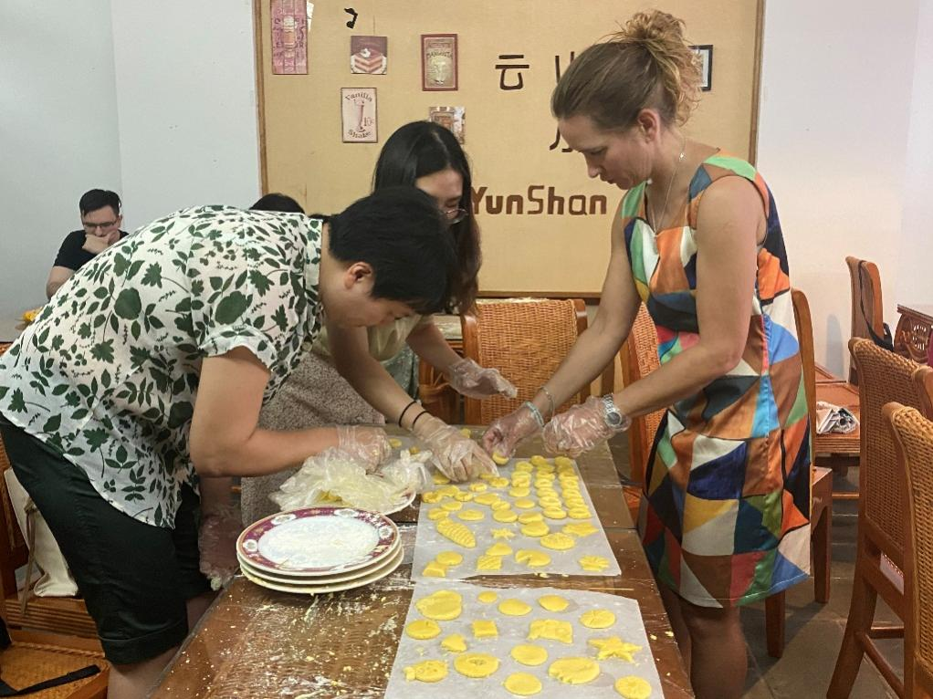随后,老师们五人一组,开始制作曲奇。组员们纷纷发挥自己的想象与创造力,将黄油面团揉捏塑造成各种形状并绘上特色花纹。半成品摆上桌,大家互相欣赏并帮忙完善,其乐融融。